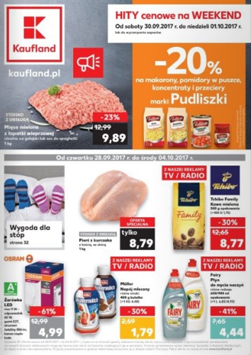Na okładce aktualnej gazetki promocyjnej Kauflandu znajdziemy Hity cenowe na weekend, czyli mięso mielone z łopatki wieprzowej idealne na gołąbki lub sos do spaghetti 1 kg za 9,89 zł i rabat 20% na makarony, pomidory w puszce, koncentraty i przeciery marki Pudliszki, a także pierś z kurczaka z kością ze skórą 1 kg za 8,79 zł i żarówkę LED Osram o mocy 9 W za 4,99 zł oraz produkty z reklamy TV / RADIO, tj. kawa mielona Tchibo Family 500 g za 8,77 zł, napój mleczny Mullermilch 400 g za 1,79 zł i płyn do mycia naczyń Fairy różne rodzaje za 4,44 zł.
