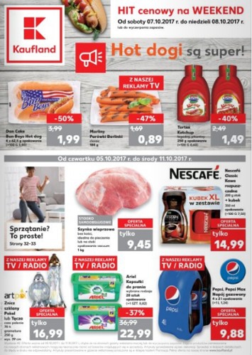 Na pierwszej stronie gazetki promocyjnej Kauflandu znajdziemy produkty z reklamy TV / RADIO, tj. znicz szklany Pokal lub Tęcza o czasie palenia 70 h i gramaturze 250 g za 16,99 zł, kapsułki do prania Ariel 28 sztuk za 22,99 zł i napój gazowany Pepsi lub Pepsi Max 4×2 L za 9,88 zł, a także szynkę wieprzową bez kości idealną do pieczenia lub na steki w opakowaniu vacuum 1 kg za 9,45 zł i kawę rozpuszczalną Nescafe 200 g + kubek 350 ml za 14,99 zł oraz Hit cenowy na weekend od soboty do niedzieli, czyli Bun Boys Hot dog Dan Cake 4×62,5 g za 1,99 zł, ketchup Tortex łagodny lub pikantny 250 g za 1,49 zł i produkt z reklamy TV – parówki Berlinki Morliny classic 100 g za 89 groszy.