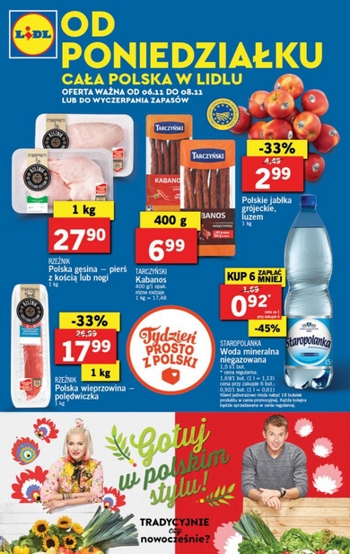Niebieska gazetka sieci sklepów Lidl ważna od poniedziałku do środy na okładce prezentuje Polską gęsinę Rzeźnik – pierś z kości lub nogi w cenie 27,90 zł za 1 kg, Polską wieprzowinę Rzeźnik – polędwiczkę w cenie 17,99 zł za 1 kg, kabanosy Tarczyński 400 g za 6,99 zł, polskie jabłka grójeckie 1 kg za 2,99 zł i wodę mineralną niegazowaną Staropolanka 1,5 L w cenie 92 grosze przy zakupie 6 butelek.