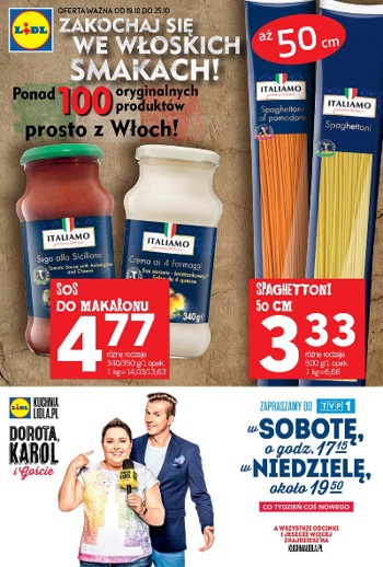 Nowa gazetka promocyjna Lidl – „Zakochaj się we włoskich smakach! Ponad 100 oryginalnych produktów prosto z Włoch”.