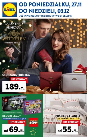 Pierwsza strona gazetki promocyjnej sieci sklepów Lidl prezentuje galanterię skórzaną Wittchen od soboty 2 grudnia, klocki LEGO od poniedziałku 27 listopada i pościel z flaneli od czwartku 30 listopada.
