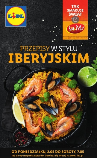 ’Przepisy w stylu iberyjskim’ – nowa gazetka promocyjna sieci sklepów Lidl, a w niej m.in. wędliny z Półwyspu Iberyjskiego, sałatka z owocami morza, gulasz Chorizo z ciecierzycą w tortilli, talerz przekąsek w stylu adriatyckim i lody w miseczce z churros.