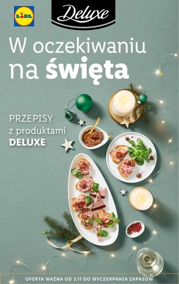’W oczekiwaniu na święta’ – nowa gazetka promocyjna sieci sklepów Lidl, a w niej przepisy z produktami Deluxe, m.in. choinki z salami i serem cheddar, crostini z gruszkami, serem gorgonzola, miodem i orzechami, castka z grzybami, szaszłyki z czosnkowych krewetek z sałatą z grejpfruta i awokado, tosty z bagietki z szynką parmeńską, salami, pasztetm i sosem musztardowym, chipsy z grana padano z kawiorem, mrowisko z makiem, rodzynkami i miodem, a także brownie z espresso i wiśnią.