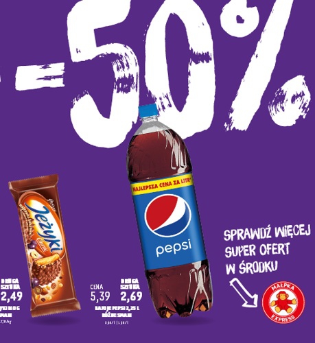 Nowa gazetka promocyjna Małpka Express – „Kup 1 i weź 1 – 50%”.