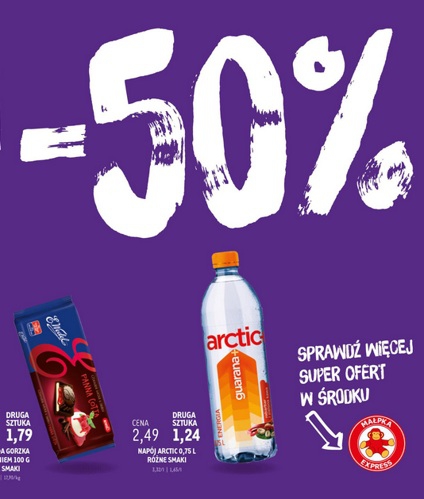 Nowa gazetka promocyjna Małpka Express – „Kup 1 i weź 1 – 50%”.