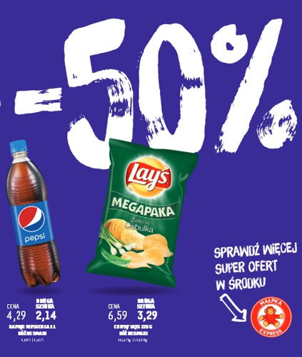 Nowa gazetka promocyjna Małpka Express – „Kup 1 i weź 1 – 50%”.