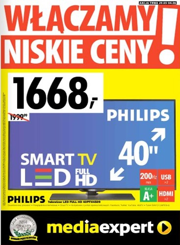 - Telewizor LED 40″ PHILIPS 40PFH4509 – 1668 zł.