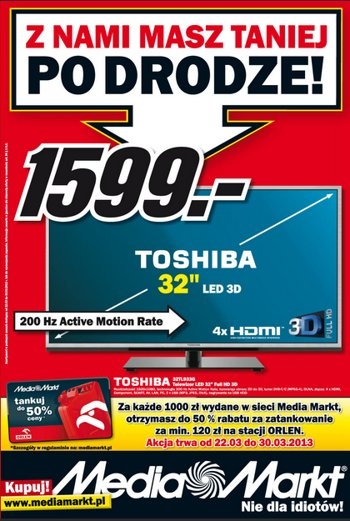 - Telewizor LED 3D 32″ TOSHIBA 32TL933 – 1599 zł.