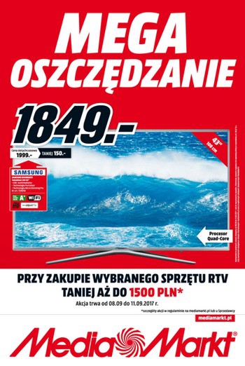 Na okładce gazetki promocyjnej Media Markt Mega oszczędzanie znajdziemy telewizor LED 43 cale SAMSUNG UE43M5672AU z technologią PurColour i Micro Dimming Pro za 1849 zł, a także informację o akcji promocyjnej, w któej przy zakupie wybranego sprzętu RTV taniej aż do 1500 zł.