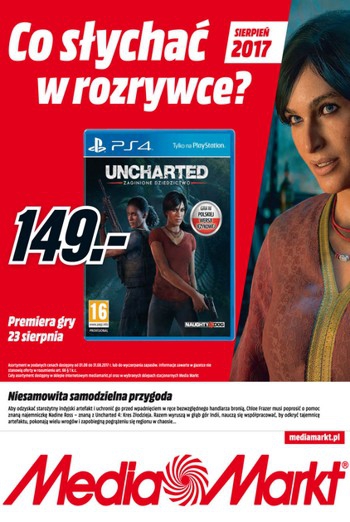 Gazetka promocyjna Media Markt poświęcona rozrywce na swojej okładce informuje o możliwości nabycia w przedsprzedaży gry na PS4 Uncharted: Zaginione Dziedzictwo. Nie jest to jedyna nowość na rynku gier, albowiem na kolejnych stronach Media Markt prezentuje kolejne premiery, tj. FIFA 18 i PES 2018, a także Destiny 2 czy Agents of Mayhem. Kolejną nowością jest tm razem konsola Nintendo 2DS XL.