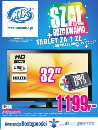 W najnowszej gazetce promocyjnej Mixelectronics SZAŁ ROZDAWANIA ! TABLET ZA ZŁ DO WSZYSTKICH TV OD 32”.Oferta ważna od 11.10 do 24.10.