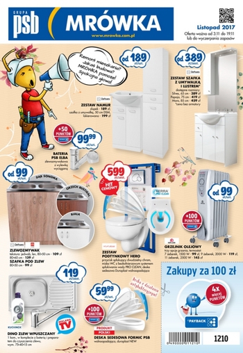 Na okładce aktualnej gazetki promocyjnej Ogrzejemy Cię sieci sklepów Mrówka PSB znajdziemy m.in. piecyk gazowy Volten za 199,99 zł piec stalowy Master LM 7 kW za 299 zł, bateryjny czujnik dymu 9 V za 25,90 zł, czujnik gazu ziemnego AC 230 V za 75,90 zł, bateryjny czujnik tlenku węgla (czadu) za 89,90 zł czy grzejnik aluminiowy Power 70 w cenie 17,99 zł za żeberko.