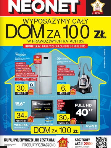 Nowa gazetka promocyjna Neonet – „Wyposażymy cały dom za 100 zł w prawdziwych ratach 0%”.