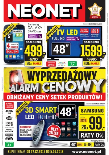 Nowa gazetka promocyjna Neonet – „Wyprzedażowy alarm cenowy – obniżamy ceny setek produktów!”.