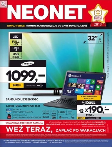 Aktualna gazetka promocyjna Neonet – „Weź teraz, zapłać po wakacjach”.