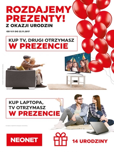 Nowa gazetka promocyjna Neonet – „Rozdajemy prezenty z okazji urodzin!”.