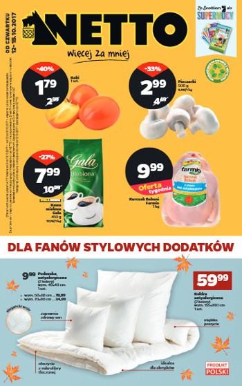 W gazetce promocyjnej Netto Dla fanów stylowych dodatków na okładce znajdziemy kołdrę antyalergiczną z miękkim poszyciem i obszyciem z mikrofibry tłoczonej o wymiarach 155×200 cm za 59,99 zł, poduszkę antyalergiczną o wymiarach 40×40 cm za 9,99 zł, a także kaki 1 sztukę za 1,79 zł, pieczarki 500 g za 2,99 zł, kawę mieloną Gala Ulubiona 450 g za 7,99 zł i kurczaka Babuni Farmio 1 kg za 9,99 zł.