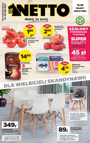 Okładka gazetki promocyjnej Netto zapowiada akcję promocyjną Dla wielbicieli Skandynawii i zachęca do stworzenia wyjątkowej aranżacji w stylu skandynawskim dzięki zestawowi, w którego skład wchodzą: drewniany stół w stylu skandynawskim z solidnym blatem z płyty MDF, stabilnym, drewnianym stelażem i antypoślizgowymi nakładkami za 349 zł oraz krzesło w stylu skandynawskim o nowoczesnym wzornictwie, z siedziskiem i oparciem wykonanym z trwałego tworzywa i antypoślizgowymi nakładkami za 89 zł. Na drugiej stronie Szalony poniedziałek, a w nim szalone rabaty, które startują przy zakupach z tej strony za min. 45 zł. Do wyboru mamy kiełbasę śląską Morliny 1 kg za 8,99 zł, Piwo Kasztelan Niepasteryzowane 6×500 ml za 10,99 zł, zawieszkę do WC Bref Power Aktiv 2×50 za 5,45 zł i musli z owocami bez dodatku cukru Sante 300 g za 3,29 zł.