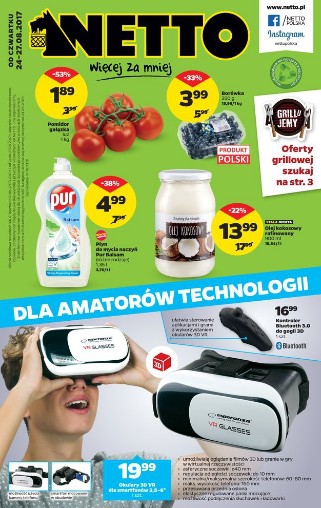 Na okładce gazetki promocyjnej Netto znajdziemy 4 artykuły spożywcze taniej nawet o 53%, a także coś Dla amatorów technologii, czyli okulary 3D VR dla smartfonów 3,5-g” umożliwiające oglądanie filmów 3D lub granie w gry w wirtualnej rzeczywistości z asferycznymi soczewkami, regulacją odległości soczewek, przesuwaną przednią osłoną, elastycznymi regulowanymi paskami mocującymi, a także możliwością podłączenia słuchawek i ładowarki oraz kontroler Bluetooth 3.0 do gogli 3D ułatwiający sterowanie aplikacjami i grami z wykorzystaniem okularów 3D VR.