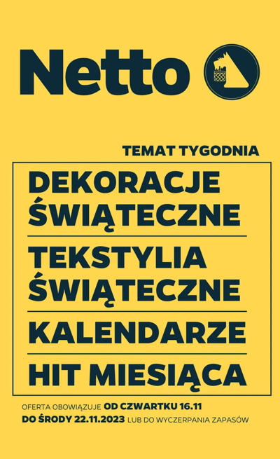 Gazetka promocyjna sieci handlowej Netto na tydzień 46/23 ważna od 16 do 22 listopada 2023 roku włącznie lub do wyczerpania zapasów. Znaki firmowe i towarowe należą do ich właścicieli. Sprzedaż produktów tylko w ilościach detalicznych. Wszystkie ceny w PLN zawierają podatek VAT.