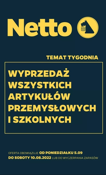’Wyprzedaż wszystkich artykułów przemysłowych i szkolnych’ – nowa gazetka promocyjna sieci sklepów Netto.