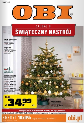 Cenowe okazje z gazetki promocyjnej Obi to artykuły, tj. storczyk Phalaenopsis już od 17,99 zł, poinsencja – gwiazda betlejemska już od 10,99 zł, bombki plastikowe w woreczku 20 sztuk już od 12,99 zł, łańcuch świetlny wewnętrzny LED już od 7,99 zł, choinka sosna Colorado już od 12,99 zł, projektor LED do użytku na zewnątrz budynku za 49,99 zł, kinkiet LED Meleto już od 29,99 zł, plafon LED Marlengo o mocy 24 W za 149 zł, panele podłogowe City w cenie 17,99 zł za 1 m2, płytki ścienne Molino w cenie 29,99 zł za 1 m2, klej do kuchni i łazienek Atlas 22,5 kg za 28,99 zł, skrzydło drzwiowe wewnętrzne Alvaro za 229 zł, zestaw mebli kuchennych dąb sonoma składający się z 5 szafek za 269 zł, piec stalowy Eko Lidia o mocy 3-6 kW za 1999 zł, szlifierka kątowa Makita GA5030R o mocy 720 W za 255 zł, spawarka inwerterowa Awelco ARC250 za 499 zł, bateria umywalkowa Granat za 79,99 zł, kolumna z deszczownicą Inveana Elea za 149 zł, WC kompakt Inker Modena z deską wolnoopadającą za 249 zł, zestaw podtynkowy Grohe Senner z pneumatycznym systemem spłukiwania za 799 zł czy kabina prysznicowa Carrara z hartowanego szkła z powłoką ochronną za 1299 zł.