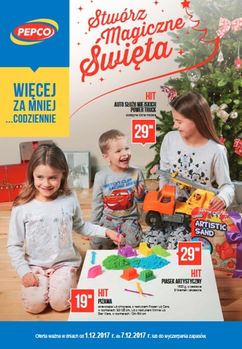 Na okładce najnowszej gazetki promocyjnej Stwórz Magiczne Święta sieci sklepów Pepco znajdziemy auto służb miejskich Power Truck dostępne w różnych modelach za 29,99 zł, piasek artystyczny 1500 g w zestawie z 9 foremkami i akcesoriami za 29,99 zł i piżamę dziewczęcą lub chłopięcą z nadrukiem Frozen, Cars, Minnie lub Star Wars za 19,99 zł.