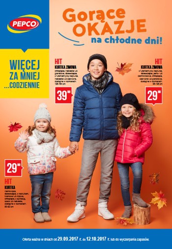 Na okładce aktualnej gazetki promocyjnej Pepco Gorące okazje na chłodne dni znajdziemy kurtkę zimową chłopięcą w kolorze niebieskim lub granatowym i dziewczęcą z futerkiem przy kapturze w kolorze niebieskim lub czerwonym za 39,99 zł, kurtkę zimową dziewczęcą z futerkiem przy kapturze w kolorze różowym lub chłopięcą w kolorze czerwonym i granatowym oraz kurtkę niemowlęcą dziewczęcą z nadrukiem w kolorze kremowym lub różowym i chłopięcą z aplikacją w kolorze szarym lub niebieskim za 29,99 zł.