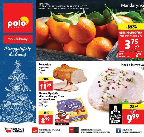 Na okładce najnowszej gazetki promocyjnej Polo Market znajdziemy mandarynki w cenie 3,75 zł za 1 kg przy zakupie 2, polędwicę sopocką Pekpol 1 kg za 11,99 zł, Piankę Alpejskie Mleczko Happy Cows lub waniliowe 330 g za 8,99 zł i pierś z kurczaka 1 kg w cenie 9,99 zł.