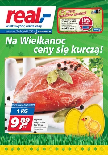 Nowa gazetka promocyjna sieci handlowej Real – „Na Wielkanoc ceny się kurczą!”.