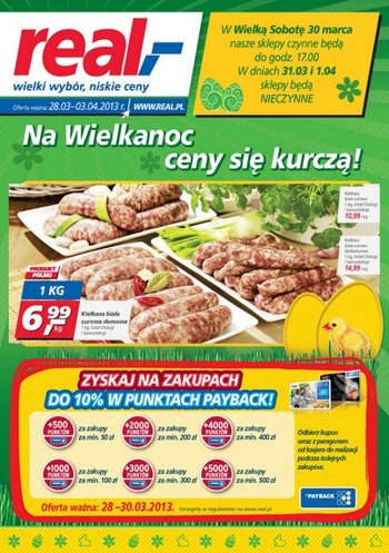 Nowa gazetka promocyjna sieci handlowej Real – „Na Wielkanoc ceny się kurczą!”.