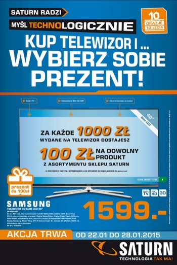 Nowa gazetka promocyjna Saturn – „Kup telewizor… i wybierz sobie prezent!”.