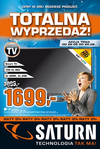 Nowa gazetka promocyjna Saturn – „Totalna wyprzedaż! Ceny w dół! Będziesz piszczeć”.