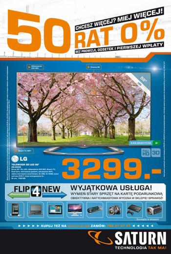 Nowa gazetka promocyjna Saturn – „Chcesz więcej, miej więcej! 50 rat 0% bez prowizji, odsetek i pierwszej wpłaty”.