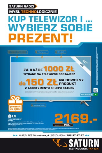 Nowa gazetka promocyjna Saturn – „Kup telewizor i … wybierz sobie prezent”.