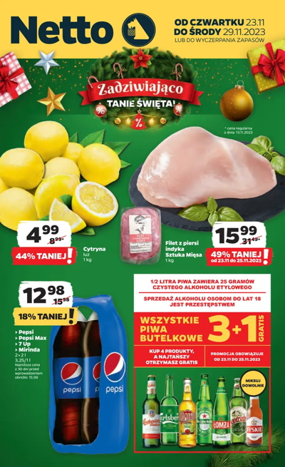 {loadposition linkNetto} 'Zadziwiająco tanie Święta' - nowa gazetka promocyjna sieci sklepów Netto. Polecane promocje z gazetki Netto: Cytryny 1 kg - 4,99 zł. Filet z piersi indyka Sztuka Mięsa 1 kg - 15,99 zł*. Pepsi, Mirinda lub 7Up 2x2…
