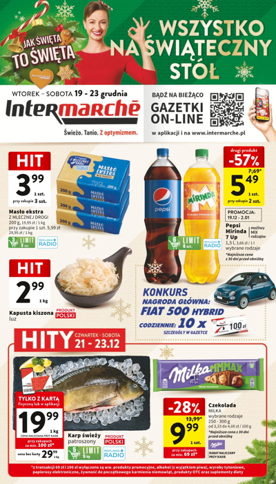 'Wszystko na świąteczny stół' - nowa gazetka promocyjna sieci sklepów Intermarche Polecane promocje z gazetki Intermarche: Masło ekstra Z mlecznej drogi 200 g - 3,99 zł*. Pepsi, Mirinda lub 7Up 1,5 L - 5,49 zł**. Kapusta kiszona 1 kg…