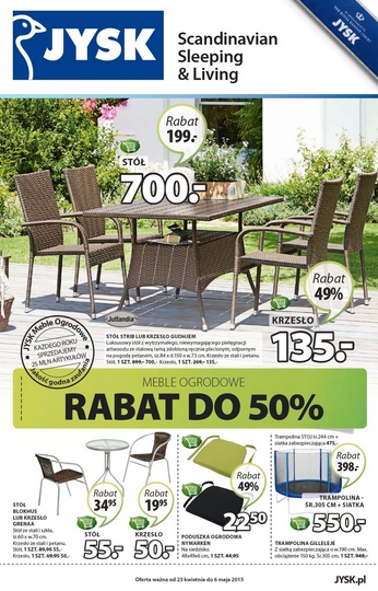 Nowa gazetka promocyjna JYSK - "Meble ogrodowe, rabat do 50%". Polecane promocje z gazetki Jysk: Rabat 25-50% na wszystkie poduszki ogrodowe. Rabat 20-40% na wszystkie lampy ogrodowe. Rabat 20-40% na wszystkie akcesoria kuchenne. Oferta ważna od 23.04…