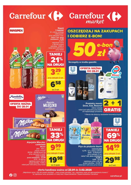 'Oszczędzaj na zakupach i odbierz e-bon 50 zł' - nowa gazetka promocyjna sieci marketów Carrefour. Polecane promocje z gazetki Carrefour: Napój Tymbark 2 L - 3,29 zł*. Alpejskie Mleczko lub czekolada Milka - 9,99 zł**. Płyn do płukania tkanin…
