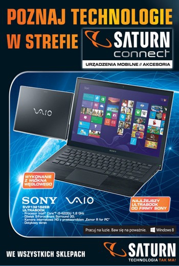 {loadposition linkMediaMarkt} Nowa gazetka promocyjna Saturn - "Poznaj technologie w strefie Saturn Connect". Polecane promocje z gazetki Saturn: Ultrabook SONY VAIO SVP1321S2E - 4799 zł. Aparat SAMSUNG NX2000 - 1999 zł. Tablet APPLE iPad Air Wi-Fi + Cellular 16GB…