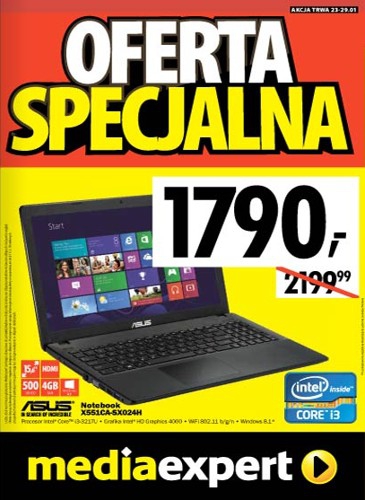 {loadposition linkMediaExpert} Nowa gazetka promocyjna Media Expert - "Oferta specjalna". Polecane promocje z gazetki Media Expert: Notebook ASUS X551CA-SX024H - 1790 zł. Telewizor LED 3D 50" SONY KDL-50W685 - 3890 zł. Aparat cyfrowy OLYMPUS VG-170 - 249 zł. …
