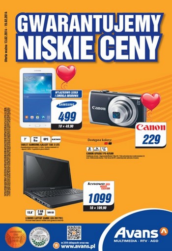 Nowa gazetka promocyjna Avans - "Gwarantujemy niskie ceny". Polecane promocje z gazetki Avans: Tablet SAMSUNG Galaxy Tab 3 Lite - 499 zł Aparat cyfrowy CANON PowerShot A2500 - 239 zł. Notebook LENOVO IdeaPad G500C-59397791 - 1099 zł. …
