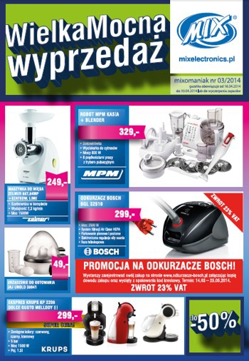 Nowa gazetka promocyjna Mix Electronics - "WielkaMocna wyprzedaż". Polecane promocje z gazetki Mix Electronics: Odkurzacz BOSCH BGL 32510 - 299 zł. Aparat cyfrowy OLYMPUS VR-370 - 99 zł. Maszynka do mielenia ZELMER 887.84MP + moduł szatkownicy - 249…