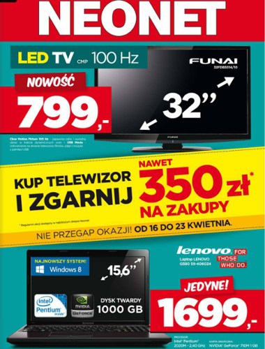 {loadposition linkNeonet} Nowa gazetka promocyjna Neonet - "Nie przegap okazji!". Polecane promocje z gazetki Neonet: Telewizor LED 32" FUNAI 32FDB5514/10 - 799 zł. Laptop LENOVO G580H 59-406024 - 1699 zł. Aparat cyfrowy NIKON COOLPIX L29 - 259,99 zł. …