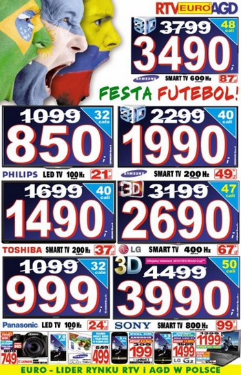 Najnowsza gazetka promocyjna RTV EURO AGD - "Festa Futebol!". Polecane promocje z gazetki RTV EURO AGD: Telewizor LED 3D 48" SAMSUNG UE48H6700 - 3490 zł. Telewizor LED 3D 50" SONY KDL-50W829B - 3990 zł. Aparat cyfrowy Canon PowerShot…