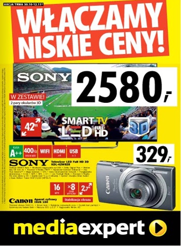 {loadposition linkMediaExpert} Nowa gazetka promocyjna Media Expert - "Włączamy niskie ceny!". Polecane promocje z gazetki Media Expert: Telewizor LED 3D 42" SONY KDL-42W828 - 2580 zł. Aparat cyfrowy CANON IXUS 150 - 329 zł. Notebook LENOVO G50-45 - 1099…