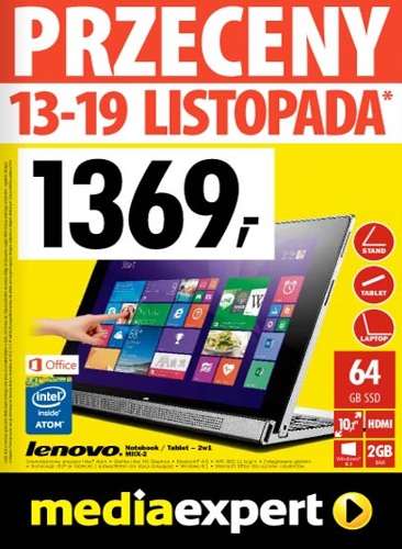 {loadposition linkMediaExpert} Nowa gazetka promocyjna Media Expert - "Przeceny". Polecane promocje z gazetki Media Expert: Notebook / Tablet – 2w1 LENOVO MIIX-2 - 1369 zł. Telewizor LED 32" PHILIPS 32PHH4309/88 - 890 zł. Aparat cyfrowy SONY DSC-W810B - 299…