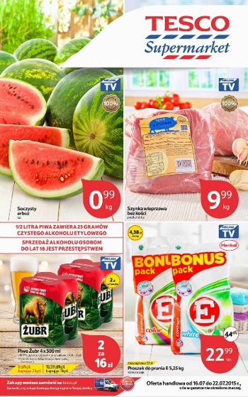 Nowa gazetka promocyjna Tesco. Polecane promocje z gazetki Tesco: Arbuz 1 kg - 0,99 zł. Szynka wieprzowa bez kości 1 kg - 9,99 zł. Proszek do prania E 5,25 kg - 22,99 zł. Oferta ważna od 16.07…