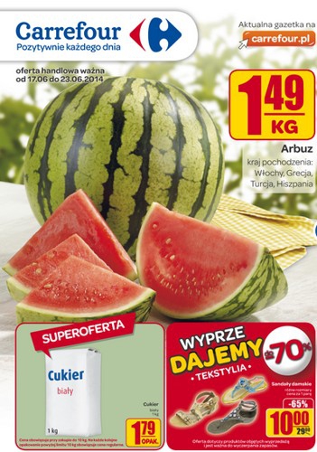 {loadposition linkCarrefour} Nowa gazetka promocyjna sieci handlowej Carrefour. Polecane promocje z gazetki Carrefour: Arbuz 1 kg - 1,49 zł. Cukier biały 1 kg - 1,79 zł. Sandały damskie - 10 zł. Oferta ważna od 17.06 do 23.06.