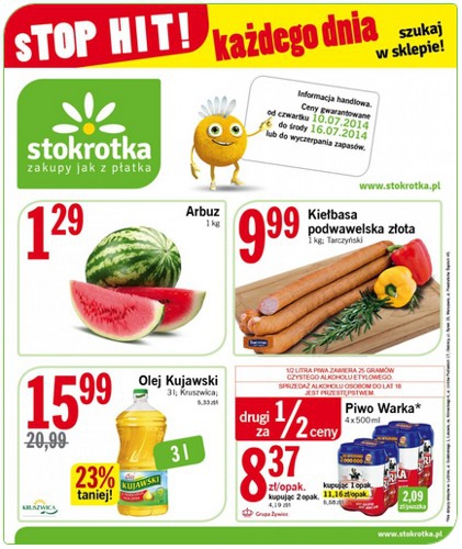 Nowa gazetka promocyjna sieci handlowej Stokrotka - "sTOP HIT!". Polecane promocje z gazetki Stokrotka: Arbuz 1 kg - 1,29 zł. Olej Kujawski 3 L - 15,99 zł. Piwo Warka 8x500 ml - 16,74 zł. Oferta ważna od…